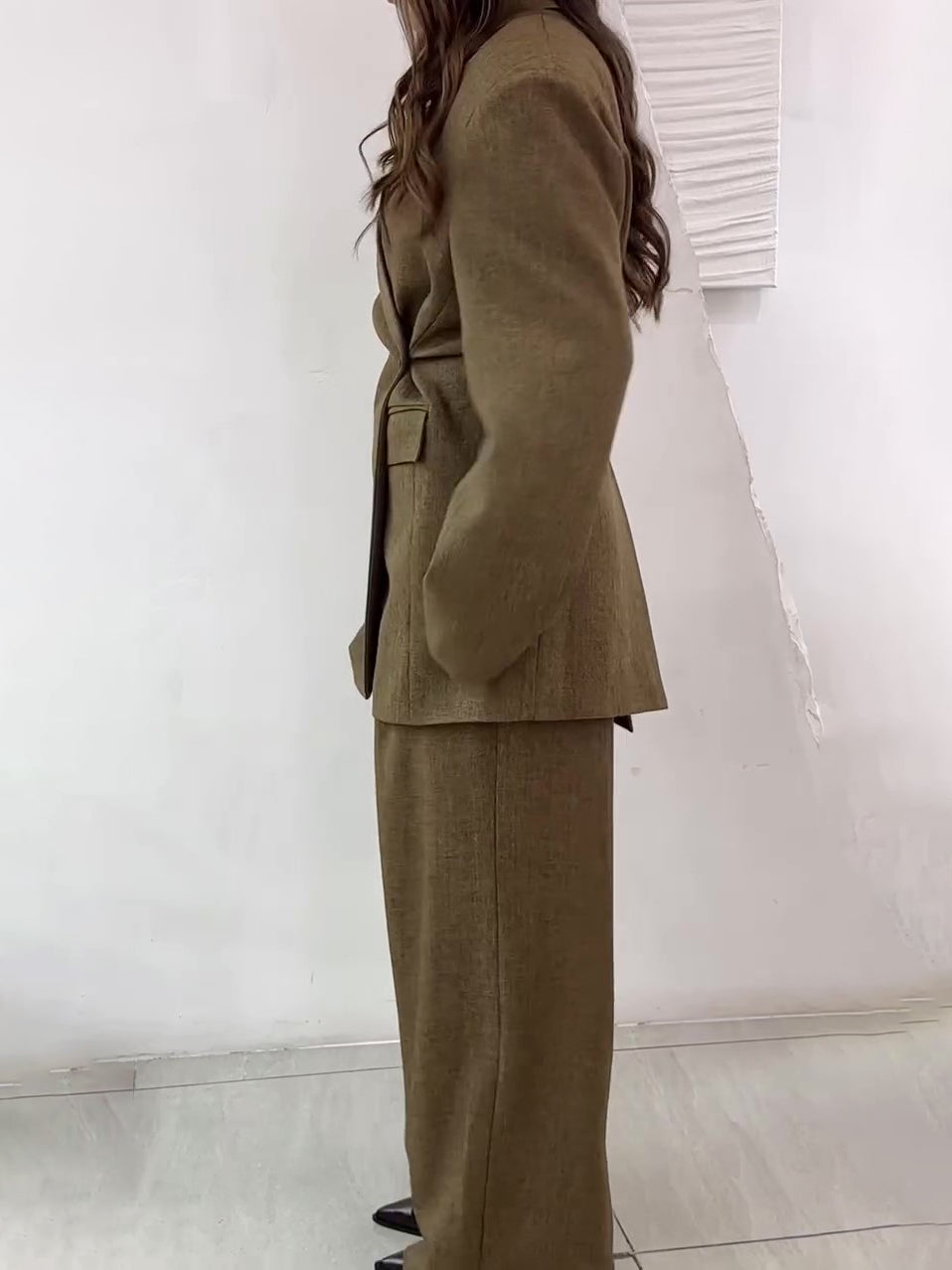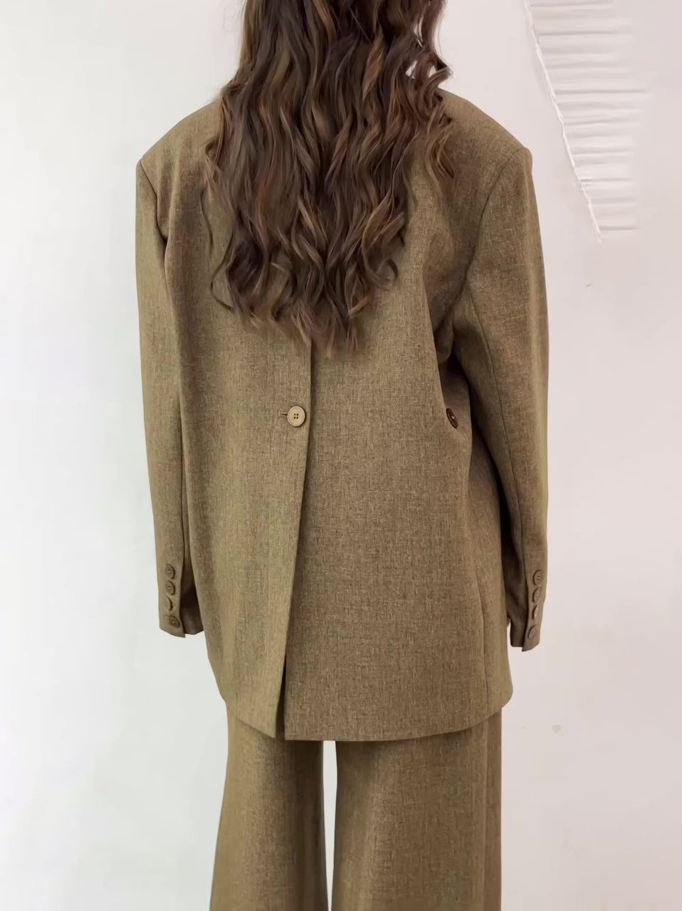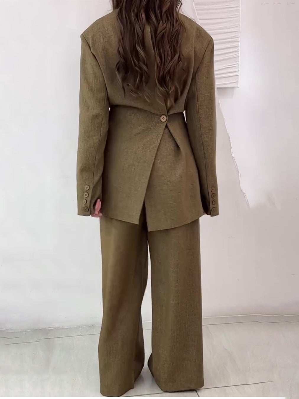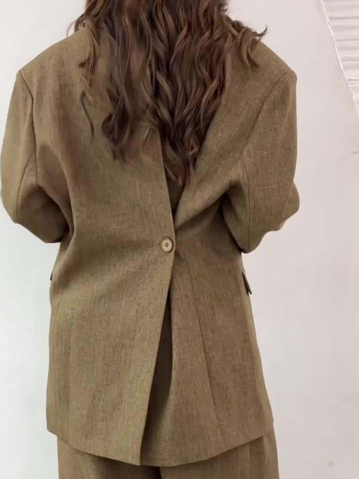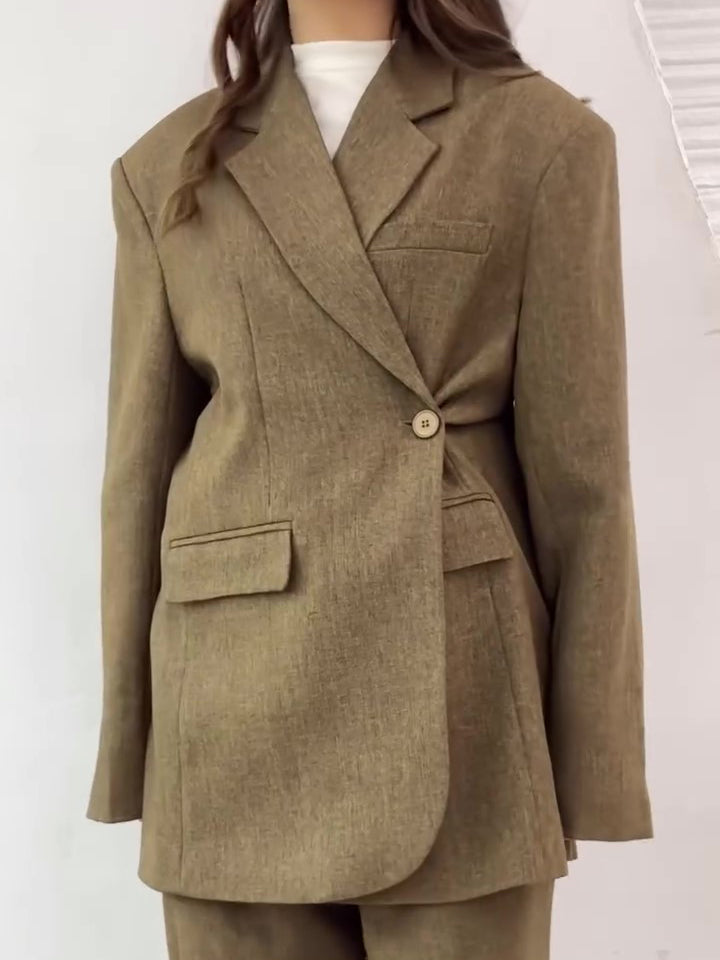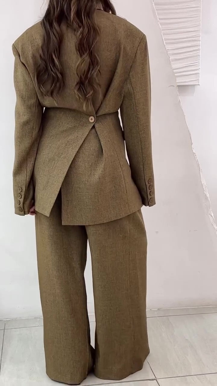 Solid Color Slit Back Buttoned Waist Blazer & High Waist Pants Set
